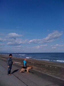 ↓写真は、途中まで見ていた甥っ子たち。デカイ犬は、いつもお世話になっているペットショプのシェパード。売れ残っているので、たまに散歩に連れ出しているそうです。しかも、勝手に海まで。ソンナノアリ??実家には2匹の老犬がいるのですが、このシェパードも家族になってくれないかなぁ。