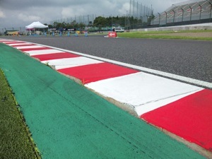 のカーブの立ち上がりなどの外側や内側に 縁石が設けられていて、レースの車が飛び出したり、内側を回りすぎない様にする物なんですが